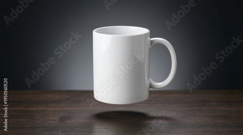 A plain white ceramic mug floats on a wooden surface against a dark background