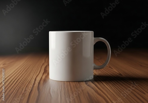 A plain white ceramic mug with a handle sits on a wooden surface isolated on white background