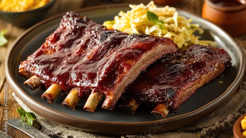 A plate of BBQ ribs with coleslaw and a side of cornbread.