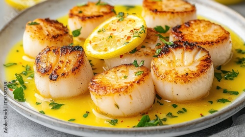 A plate of beautifully seared scallops garnished with lemon and herbs, showcasing a delicious seafood dish that looks enticing and flavorful.
