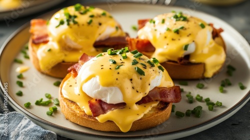plate, classic, egg, benedict, poached, canadian, bacon, sauce, toasted, english, muffin, centered, soft, natural, light, highlighting, velveting, fresh, chives, sprinkled, top