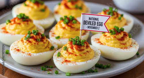 A plate of deviled eggs garnished with paprika and chives with a national deviled egg day flag