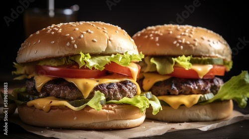 A plate of juicy burgers with melted cheese, crisp lettuce, and fresh tomato slices. Generative AI