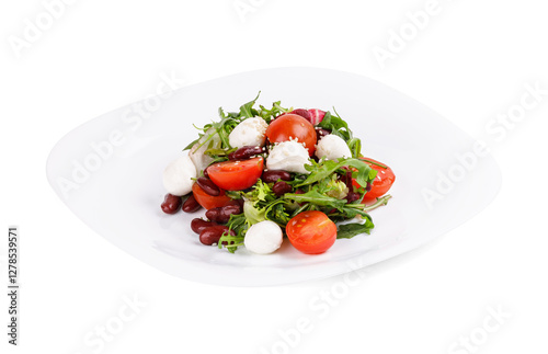 A plate with a salad of tomatoes, beans, and mozzarella