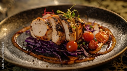 A plated dish featuring sliced chicken breast on a bed of purple cabbage with cherry tomatoes.