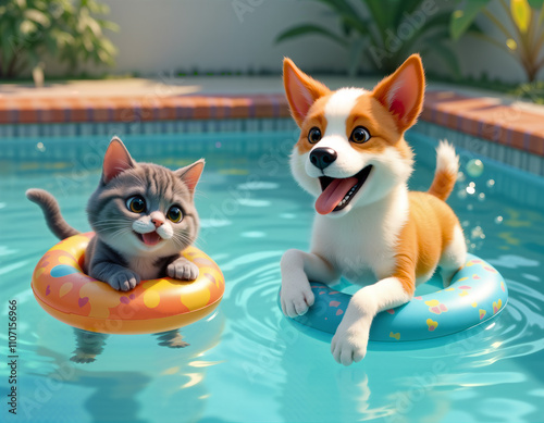 kitten, puppy, dog, cat, pool, water, floating, vacation, sunny, backyard, playful, cheerful, fun, cute, adorable, summer, swimming, relaxation, colourful, blue, happy, friends, animal, leisure, family, joyful, bright, purr, bark, cosy, vibrant, tropical, splash, furry, lounging, sunlight, paradise, entertainment, companionship, active, funny, charming, whisker, friendly, delightful, exciting, lovely