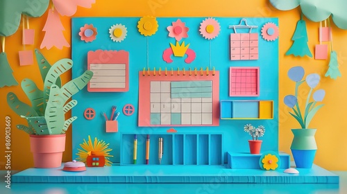 A playful paper cut depiction of a colorful bulletin board filled with class schedules, notices, and fun decorations