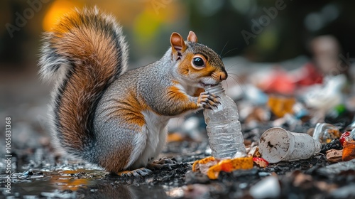 squirrel, park, nature, wildlife, animal, environment, pollution, litter, bottle, curious, exploration, habitat, afternoon, sunlight, paw, scavenging, ecosystem, recycling, waste, forest, furry, small animal, foraging, awareness, cute, behaviour, biodiversity, ecology, bin, trash, debris, scavenger, playful, forest floor, conservation, critter