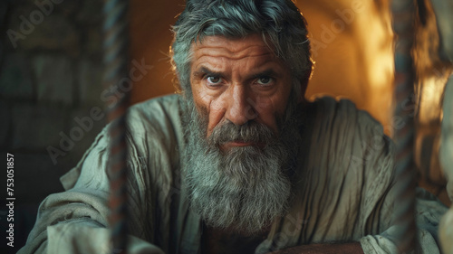 gaol, contemplation, apostle, faith, confinement, wisdom, scripture, disciple, new testament, beard, storytelling, suffering, elder, theological, prophetic, resilience, meditation, captivity, devout, face, people, person, expression, looking