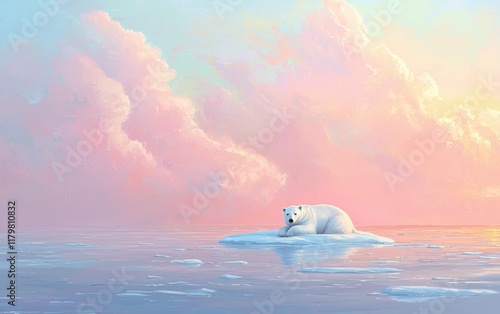 A polar bear resting on a sheet of ice surrounded by the vast Arctic ocean under a pastel sky