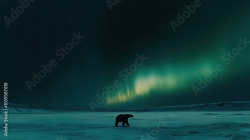 A polar bear walks across the snow in the arctic, the green aurora borealis shines in the night sky.