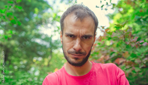 A portrait of a handsome man with beard against the background of green trees in the park.