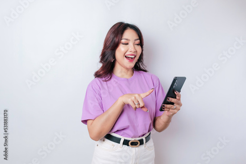 A portrait of a happy Asian woman is smiling and holding her smartphone wearing a lilac purple t-shirt isolated by a white background