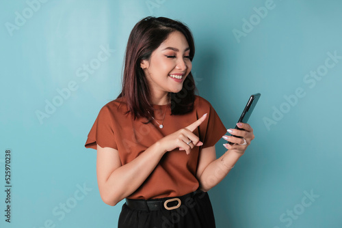A portrait of a happy Asian woman is smiling and holding his smartphone wearing brown shirt