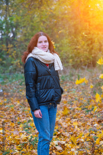 a portrait of a red - haired smiling girl in a jacket and scarf with her hair loose in full growth walks in the park . against the background of autumn nature, the concept of human emotion