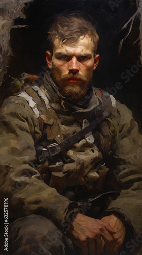 A portrait of a Slavic soldier, reflecting the warrior spirit and historical heritage of Slavic culture. This depiction captures the soldier's noble bravery and strength