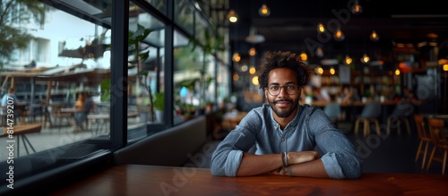 A portrait of a smiling Afro businessman wearing glasses and a shirt, seated inside a café.