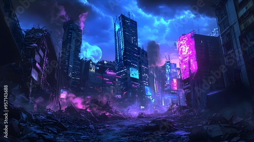 A post-apocalyptic cityscape with towering skyscrapers and neon lights, set in a dystopian future where the city lies in ruins and decay.