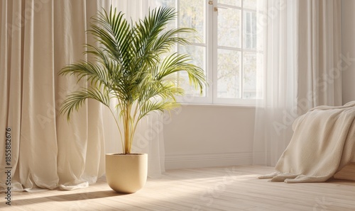 potted, palm, plant, white, ceramic, wooden, floor, room, curtain, green, window, home, interior, decorative, nature, design, houseplant, house, beautiful, indoor, fresh, leaf, growth, background, flora, wall, apartment, tropical, foliage, modern, gardening, botany, floral, style, object, furniture, bright, flower, tree, hobby, light, spring, wood, flowerpot, grow, exotic, nobody, sill, colours