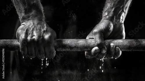 A powerful black and white image showcasing the strength and determination of a weightlifter. The image focuses on the hands, dripping with sweat