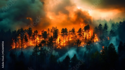 A powerful image depicting a devastating forest fire with flames consuming trees