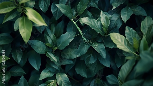 A praying mantis motionless among the green leaves, indistinguishable from its surroundings.