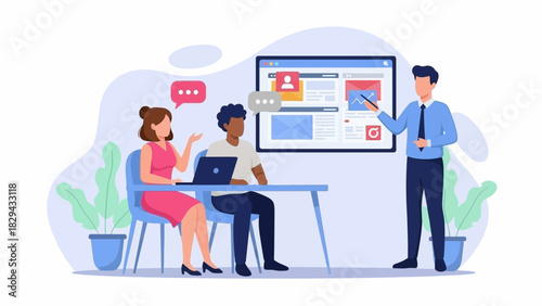 presentation, screen, man, woman, table, sitting, listening, pointing, explaining, learning, teaching, discussion, communication, business, office, meeting, collaboration, teamwork, laptop, computer, vector, illustration, design, graphic, art, cartoon, people, adult, professional, workplace, seminar, training, education, student, instructor, speaker, audience, interaction, dialogue, conversation, speech, explanation, information, cognition, idea, concept, strategy, planning, project