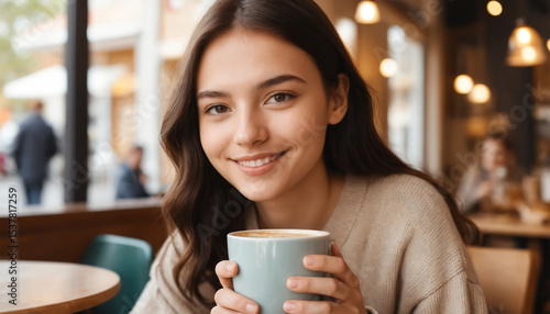 woman, hot drink, drink, cafes, cup, tea, eatery, drinking, people, smiling, smile, beverage, beauty, espresso, holding, mug, lady, bar, indoor, lifestyle, hot, person, sitting, cappuccino, glasses