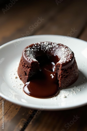 A pristine white plate holds a decadent chocolate lava cake, oozing rich, dark chocolate , studio shot, food styling, homemade
