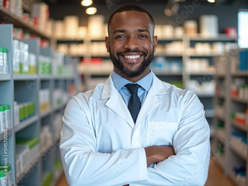 A professional and friendly pharmacist smiling confidently in a modern pharmacy, showcasing expertise and dedication to health while surrounded by a variety of medications and healthcare products