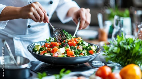 A professional chef in a modern kitchen creates a colorful vegetable dish with utmost care, skillfully mixing fresh ingredients to make an appetizing and healthy meal.