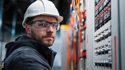 A professional electrical technician wearing a hard hat and safety glasses, standing in front of a high-voltage electrical panel