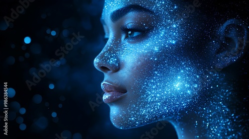 A profile of a woman illuminated by shimmering blue cosmic particles, creating a stunning celestial effect.