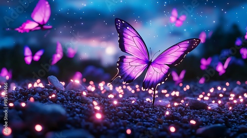 A purple butterfly glows in the night, creating a magical and fantastical scene.