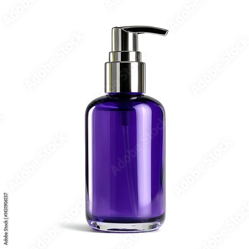 A purple lotion bottle with a silver pump dispenser, isolated on a clean white background