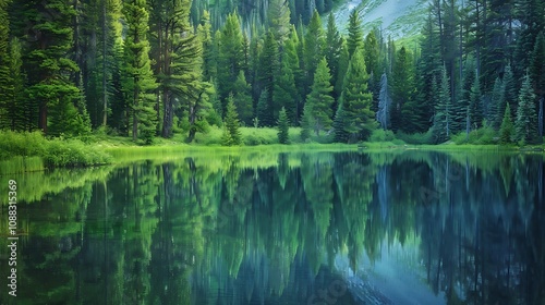 A quiet lake surrounded by dense pine trees, with the reflection of the forest mirrored on the water's surface.