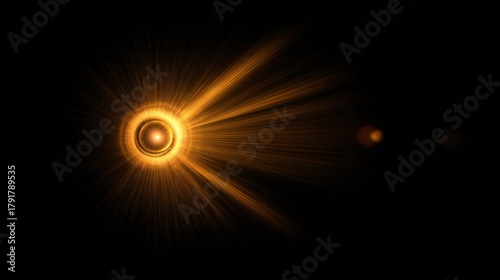 A radiant burst of golden light emanates from a central sphere, creating dynamic rays against a dark background.