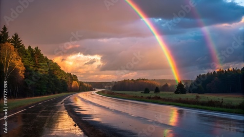 A rainbow arches over a wet road winding through a forest. The vibrant colors of the rainbow contrast beautifully with the green trees and gray sky.