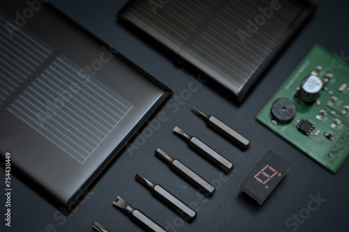 A range of different electronic components and devices with dark tones, showcasing different technologies and circuits and solar renewable energy.