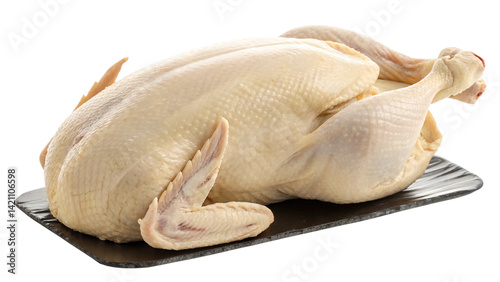 A raw goose lying like a sculpted clay figure, skin pale and smooth like wax, isolated on a transparent background.