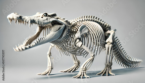 crocodile, skeleton, three-dimensional, bone, realistic, illustration, wide, format, white background, detailed, ancient, fossil, paleontology, reptile, vertebrate, prehistoric, museum, exhibit, bone structure, predator