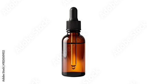 A realistic amber glass dropper bottle with a black cap, ideal for cosmetic serum or essential oil mockups, isolated on a white background as a transparent png file. 128