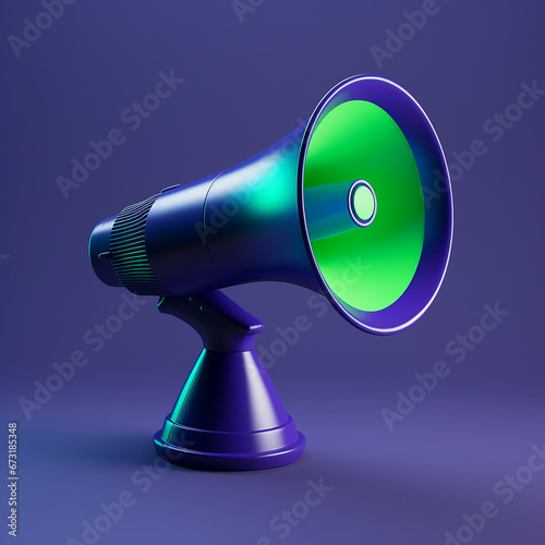 a realistic megaphone blue accent color, dark blue background color, futuristic, accent colors lime green, bright purple created with Generative Ai