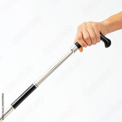 A realistic photograph of an elegant and slim silver walking cane with black trim,