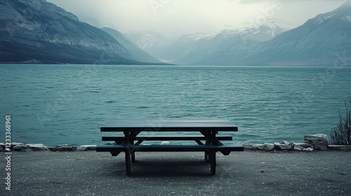 realistic, photograph, picnic, table, wooden, bench, set, against, mountain, water, creating, serene, scene, wall, art, sharpened, is, capturing, natural, beauty, nature, high, resolution