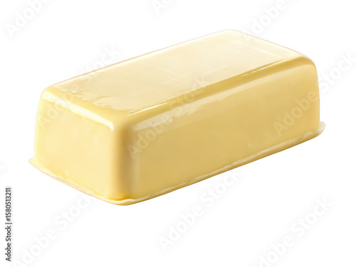 A rectangular block of yellow butter in a plastic wrapper isolated on transparent background