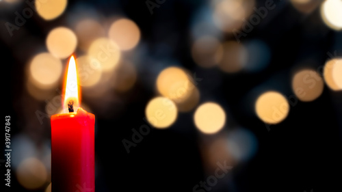 a red candle burns in the foreground in front of a colorful bokeh background