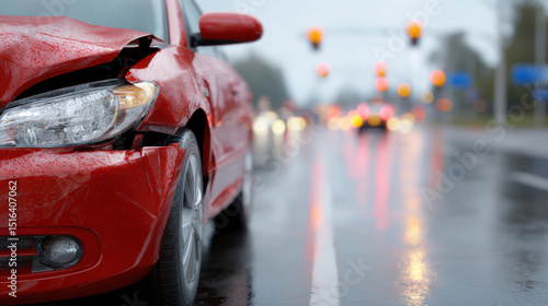 A red car with a damaged front end is parked on a wet road, with blurred traffic and traffic lights in the background.