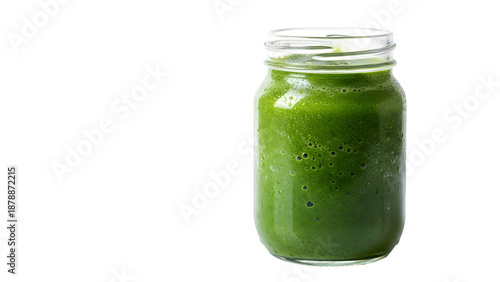 A refreshing glass jar filled with vibrant green smoothie made from fresh vegetables and fruits