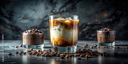 A Refreshing Iced Coffee Drink with Cream and Ice Cubes, Surrounded by Coffee Beans on a Dark Tabletop